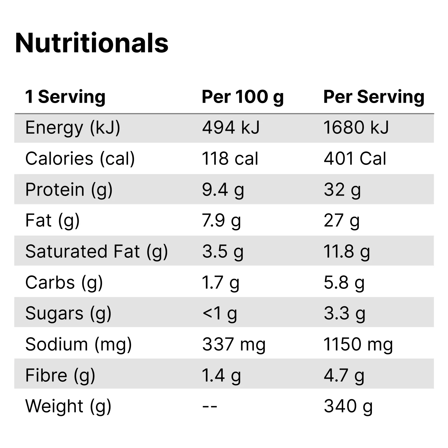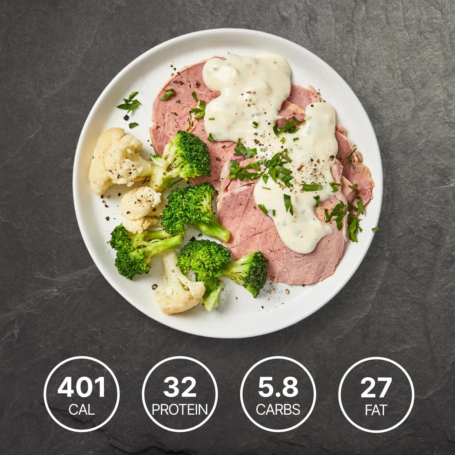 Slices of corned beef topped with a traditional creamy white sauce infused with parsley, served with fresh cauliflower and broccoli.